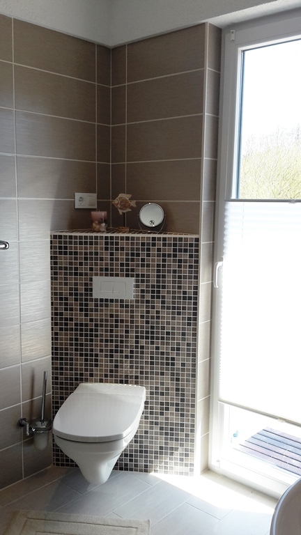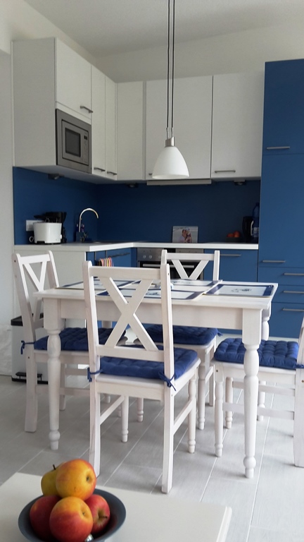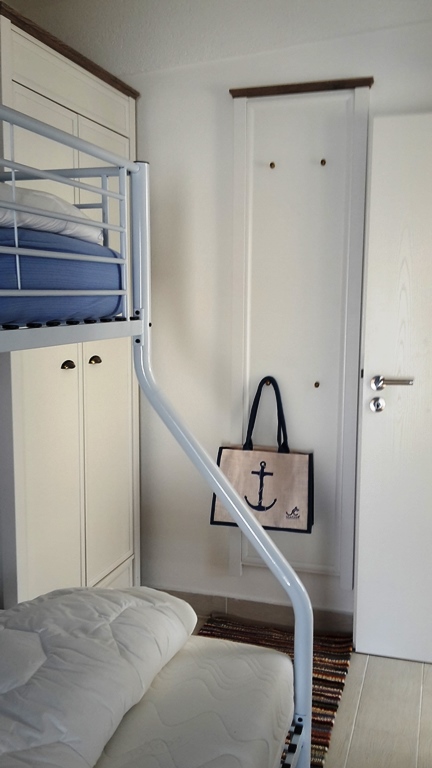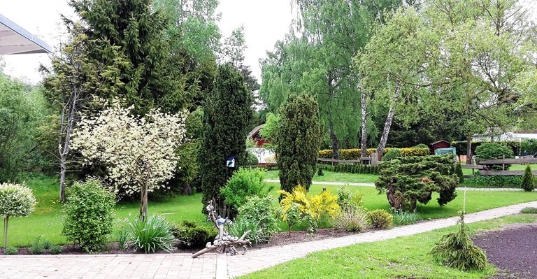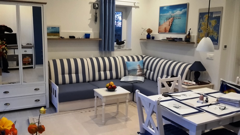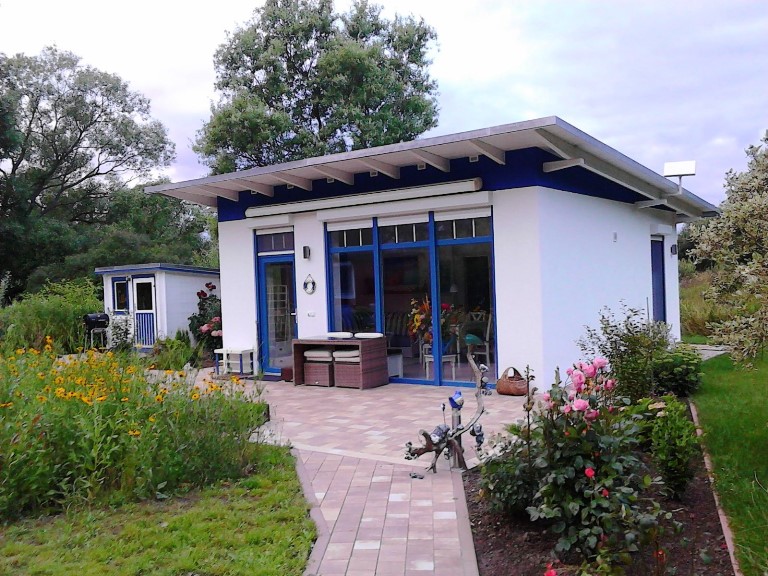 Ferienhaus ROBERT Südansicht mit Terrasse Wohnbereich mit Schlafcoutch Einbauküche Schlafzimmer Bad mit Dusche Garten